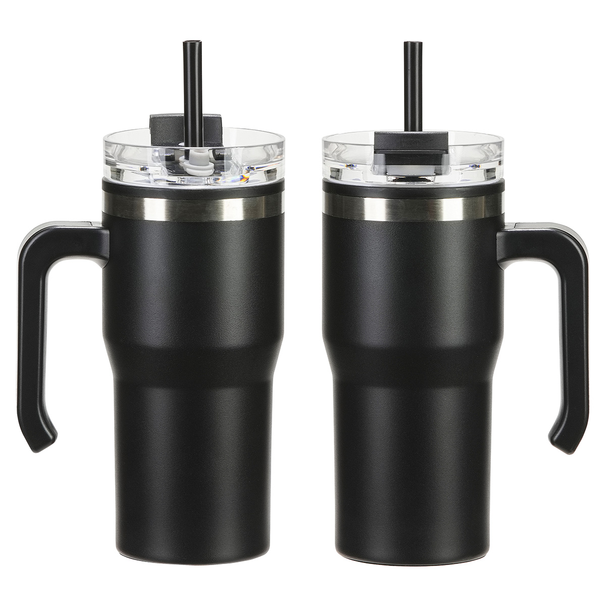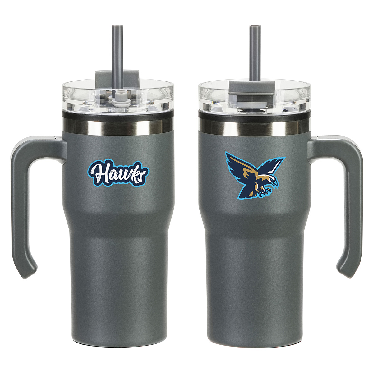 Experience ultimate hydration with our Outback 20 oz Stainless Steel/Polypropylene Mug with Lid and Straw, featuring a sleek stainless steel outer shell and a black polypropylene inner lining. The clear screw-on plastic lid includes a leak-resistant high wall, ensuring no spills. Designed with a color matched plastic handle for easy carrying, this mug keeps beverages hot or cold for up to 3 hours. It’s BPA-free and FDA certified for safety, making it perfect for everyday use. Hand wash only to maintain its quality and performance. Complies with FDA, Prop 65. 8″ H x 3.5″ Diameter